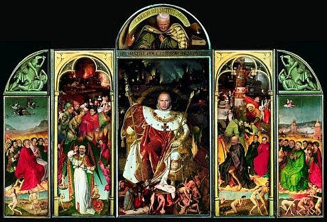 В Москве завершилась выставка "Постсоветская демократия. 15 лет пародий". Проходила она на задворках Думы и Кремля, в зале нового Манежа. На картинах - все сплошные обитатели этих соседних величественных зданий. Лица этих персонажей с помощью цифровых технологий и компьютерной графики вписаны в сюжеты полотен старых мастером, инсталлированы в кадры известных кинофильмов, прослоены разными живописными цитатами из Гойи, Брейгеля, Босха и русских передвижников.
