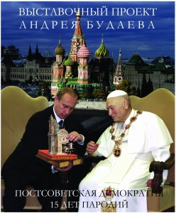 "Время Гостей"Выставка "Постсоветская демократия. 15 лет пародий"Ведущий Анна Качкаева Анна Качкаева: Сегодня у нас в гостях художник Андрей Будаев, который работает в жанре социального и политического плаката (так, во всяком случае, пишется на сайтах и в пресс-релизах), и один из персонажей его полотен, автор "Писем к президенту" журналист Александр Минкин.